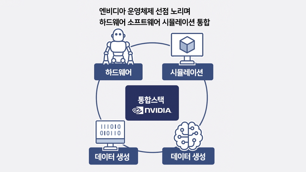 엔비디아는 GPU·엣지 컴퓨팅·시뮬레이션·AI 모델을 통합해 ‘피지컬 AI의 운영체제’가 되려는 전략을 추진하고 있다.
