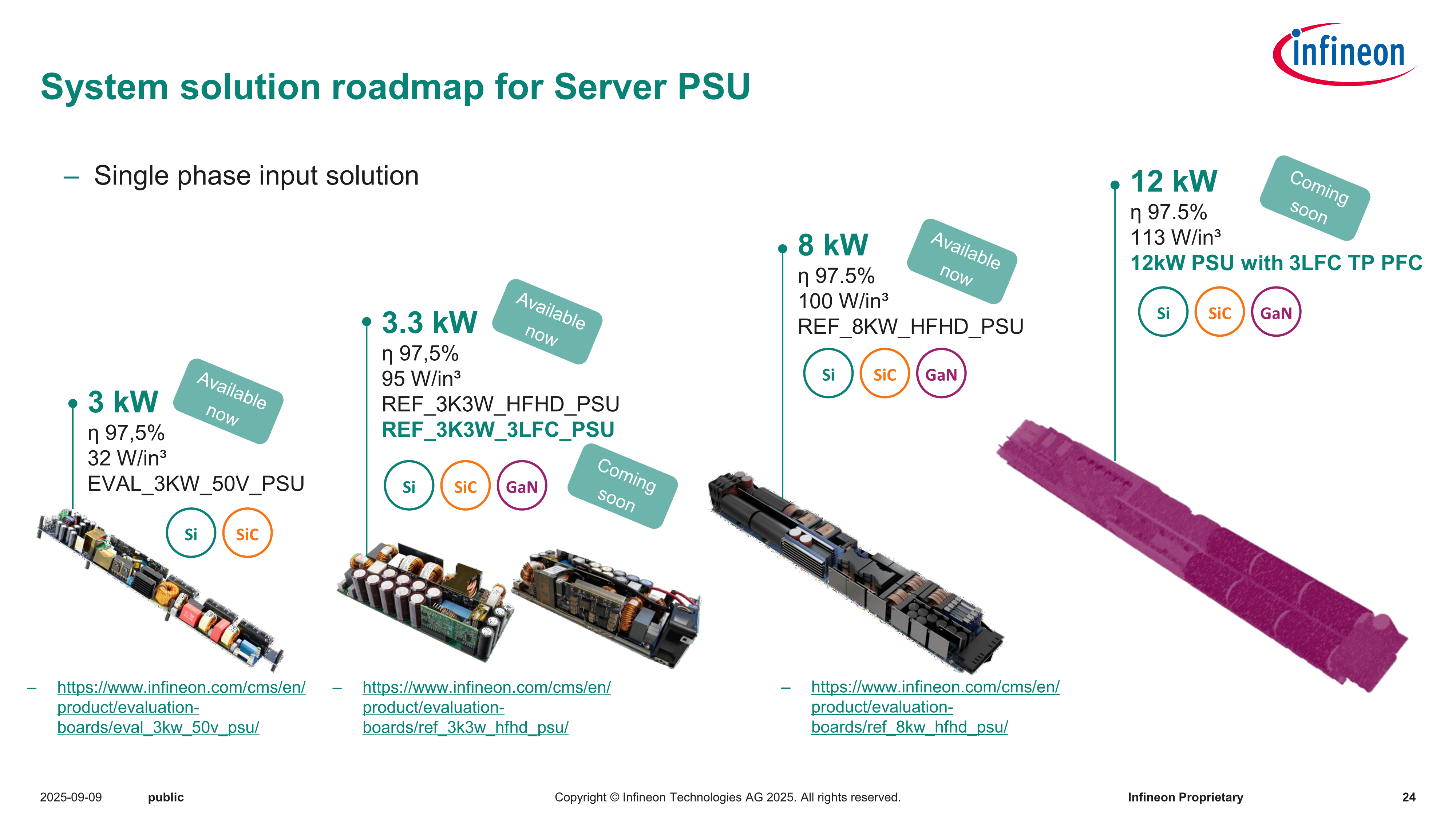 김용진 상무는 “인피니언은 실리콘(Si), 실리콘 카바이드(SiC), 갈륨 나이트라이드(GaN) 기반의 전력 반도체를 통해 다양한 전압대와 어플리케이션에 대응하고 있다”며 “특히 SiC는 고전압·고효율이 필요한 서버 PSU에 적합하며, GaN은 고주파·소형화가 필요한 DC/DC 컨버터에 강점을 가진다”고 전했다.