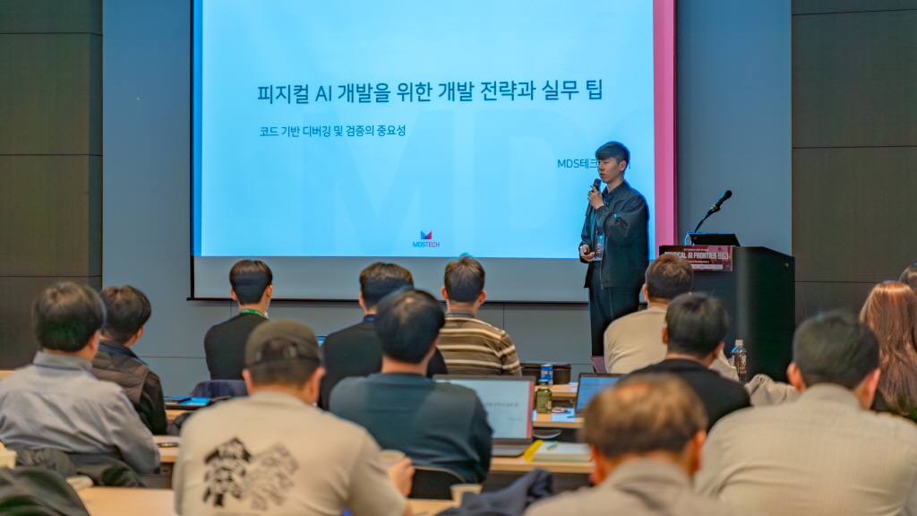 ▲김민기 MDS테크 과장이 ‘피지컬 AI 개발을 위한 개발 전략과 실무 팁’을 주제로 발표하고 있다.