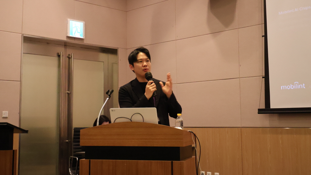 ▲신동주 모빌린트 대표이사가 AI 반도체 기술과 시장 동향을 중심으로 발표하고 있다.